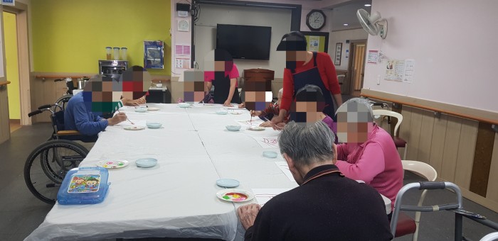 어르신께서 조금 더 그리기 편하시도록 나뭇가지는 진행자가 그려드리고, 여러색상의 물감을 사용하여 꽃잎을 표현하는 것은 어르신이 직접 하셨답니다.